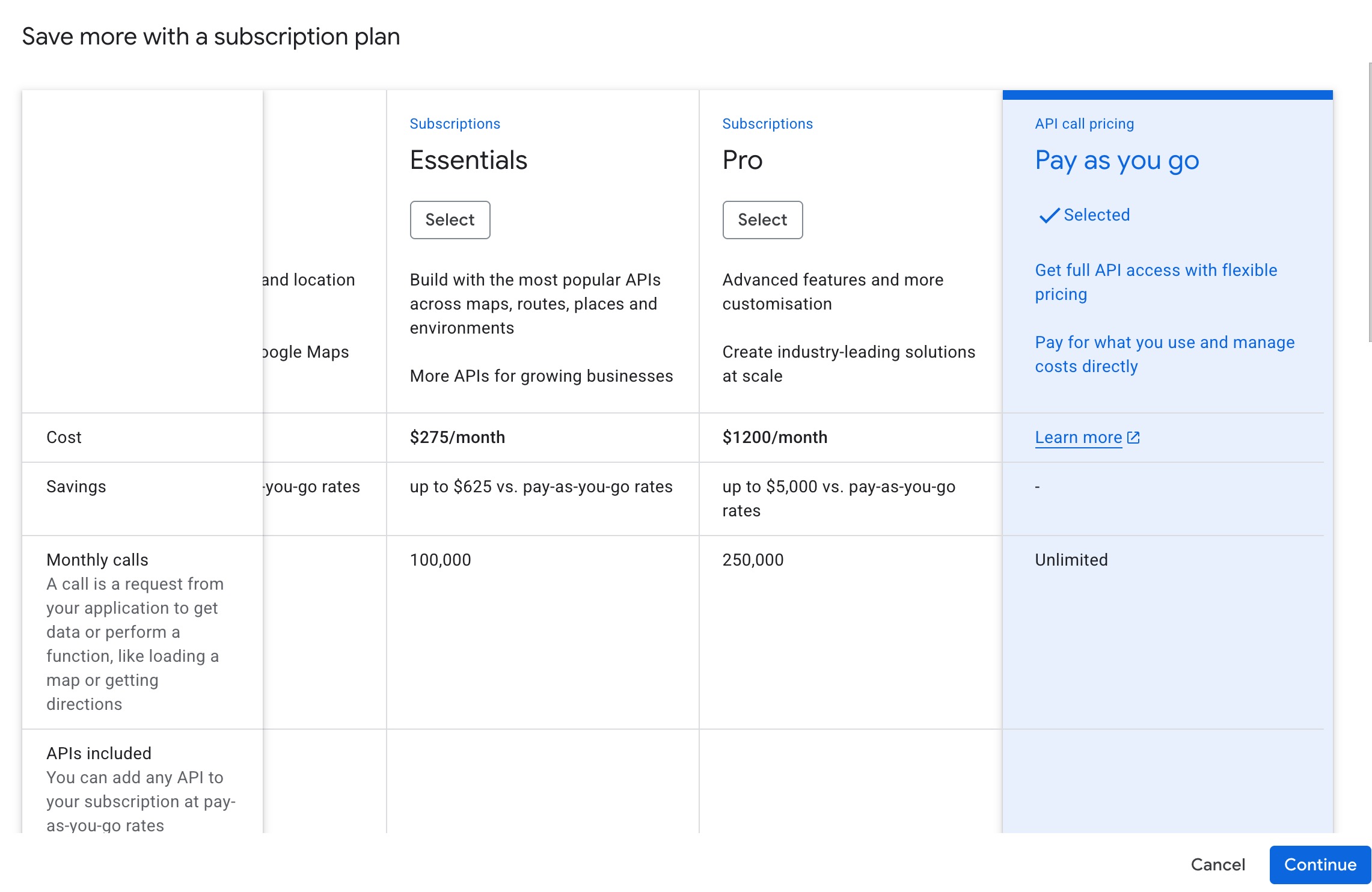 7. Scroll to the right and make sure API Call Pricing 'Pay as you go' is selected and click 'Continue'.